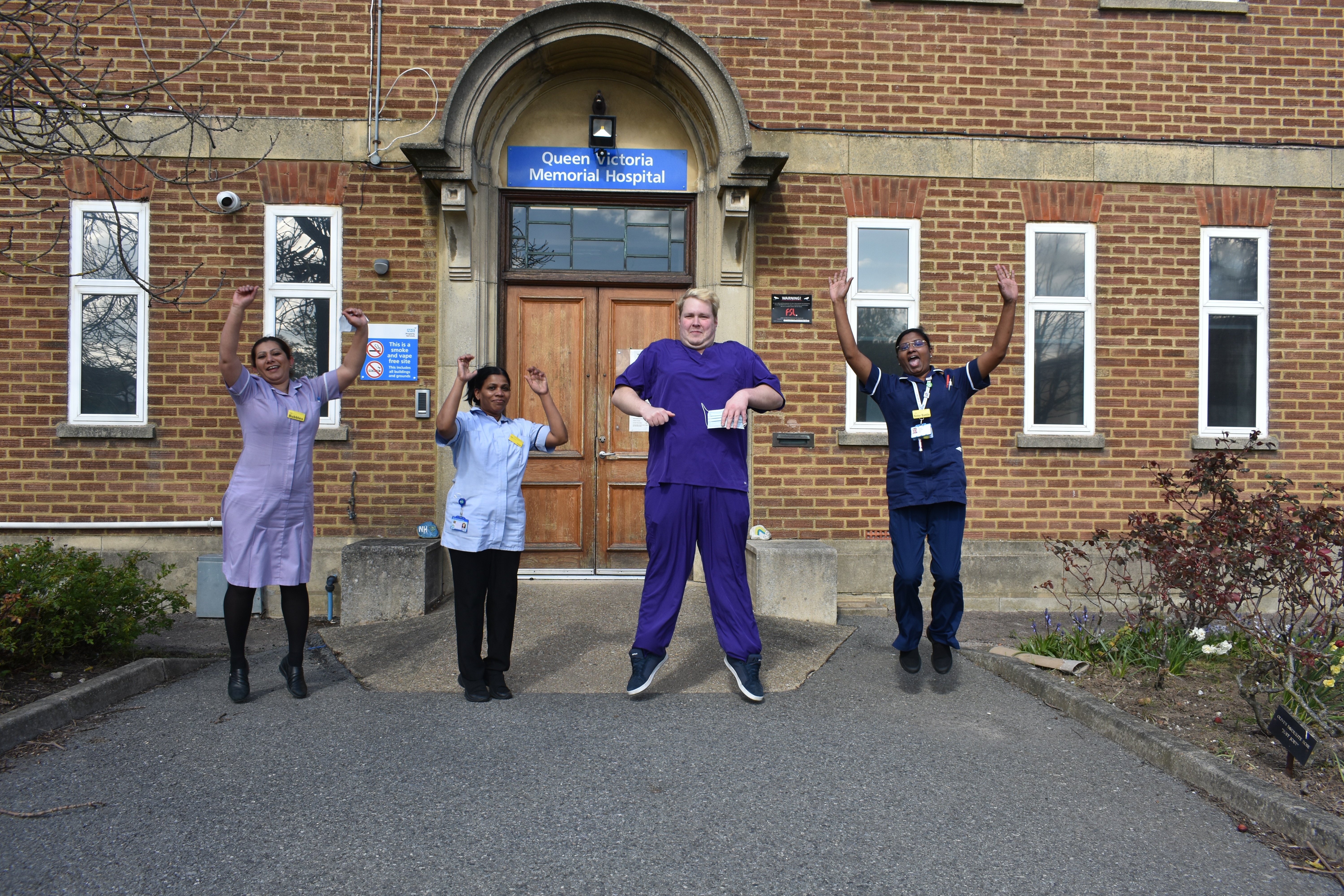 Jumping for joy: Healthcare assistant Harmeet Kaur, Nurse Sheela Moni, Healthcare Assistant Ashley Caverley and Senior Sister Bamlin Thomas.